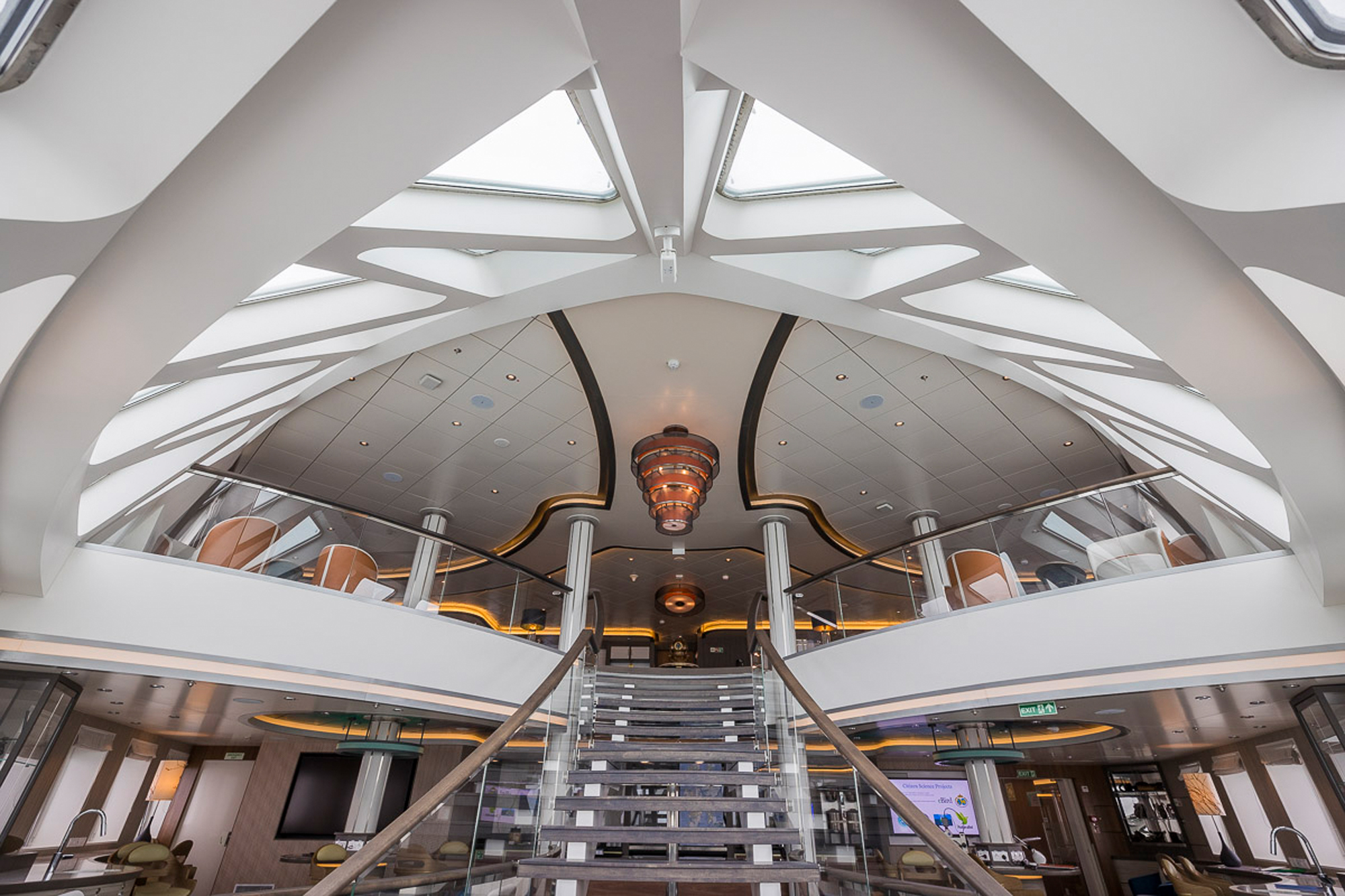 A panoramic view from a modern cruise ship's observation deck, showcasing expansive blue ocean waters and an elegant interior lounge with large glass windows.